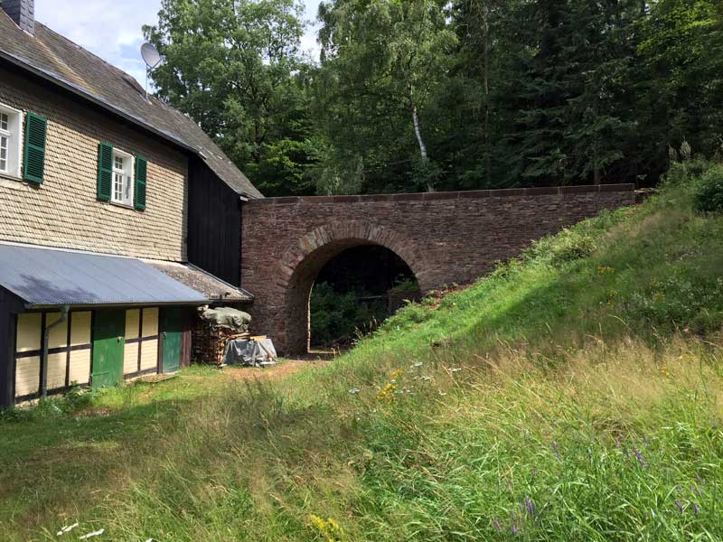 Über dieses mächtige, in Buntsandstein gemauerte Aquaedukt wird das Antriebswasser auf das Wasserrad geleitet. Das Aquaedukt wurde wie auch das übrige Gebäude im Jahr 1908 erbaut.