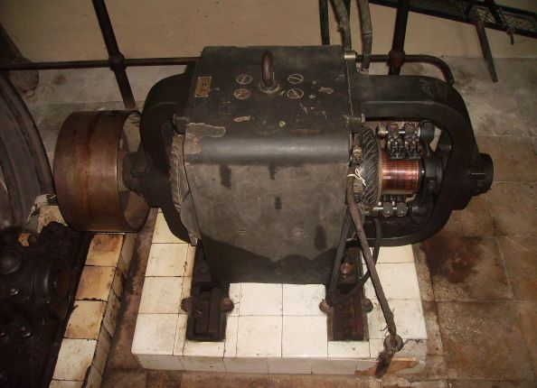 Gleichstromgenerator (Dynamo), hergestellt von den Siemens-Schuckert Werken in Berlin, Leistung etwa 20 kW. 1908 in Burgfey in Betrieb genommen.