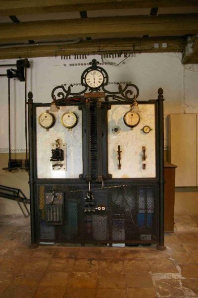 Die Marmor-Schalttafel mit Voltmeter, Amperemeter und Anzeige des Betriebszustandes. Hersteller: Armin Tenner, Installation von elektrischen Licht- und Kraftübertragungs-Anlagen, Berlin.